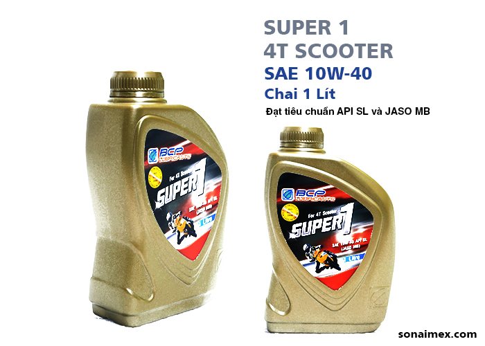BCP SUPER 1 for 4T Scooter là nhớt đa cấp tổng hợp SAE 10W-40 dành cho xe tay ga (hộp số tự động). Đây là nhớt chất lượng cao được tổng hợp từ dầu gốc cao cấp và các phụ gia đặc biệt, đạt tiêu chuẩn API SL và JASO MB.
